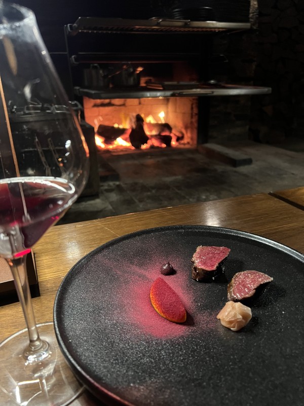 The whole beast: Venison, cooked outside on the open fire, paired with a glass of Amisfield RKV Pinot Noir 2018.
