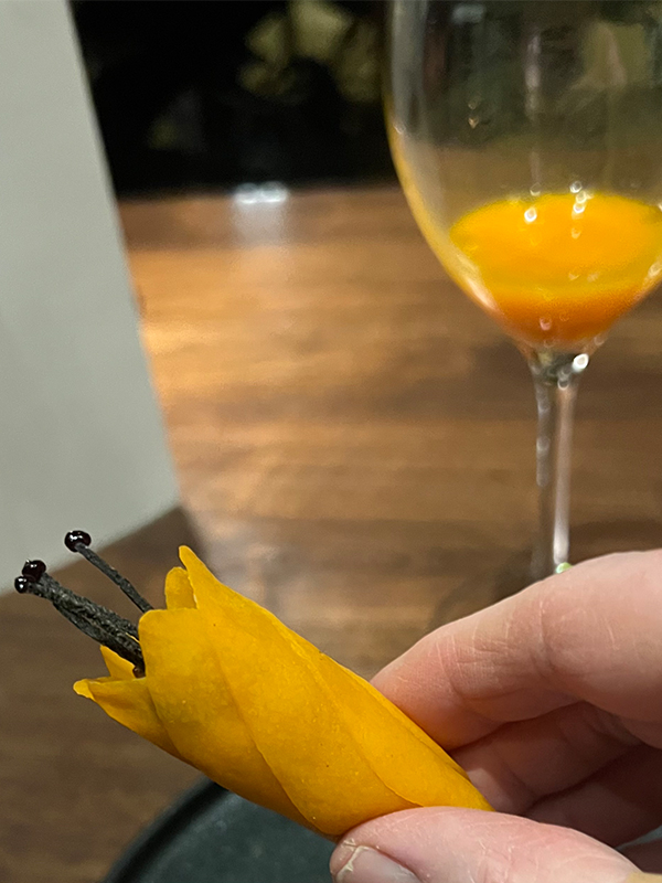 A spear of pumpkin flower paired with freshly pressed juice.