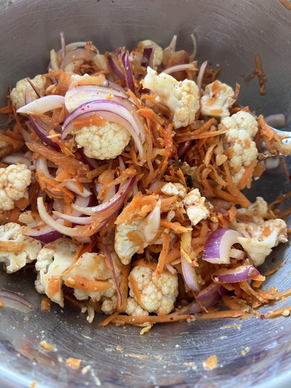 - With a metal spoon toss the vegetables through the vinegar mix for one or two minutes.