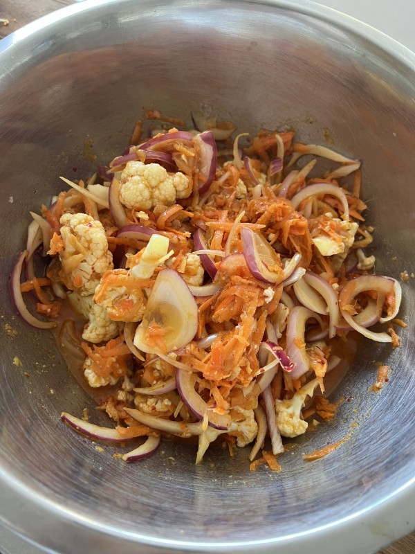 - With a metal spoon toss the vegetables through the vinegar mix for one or two minutes.