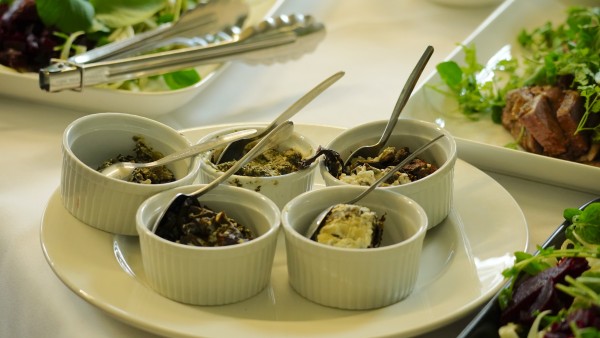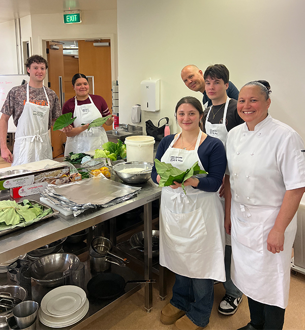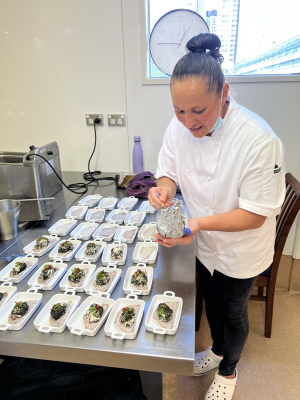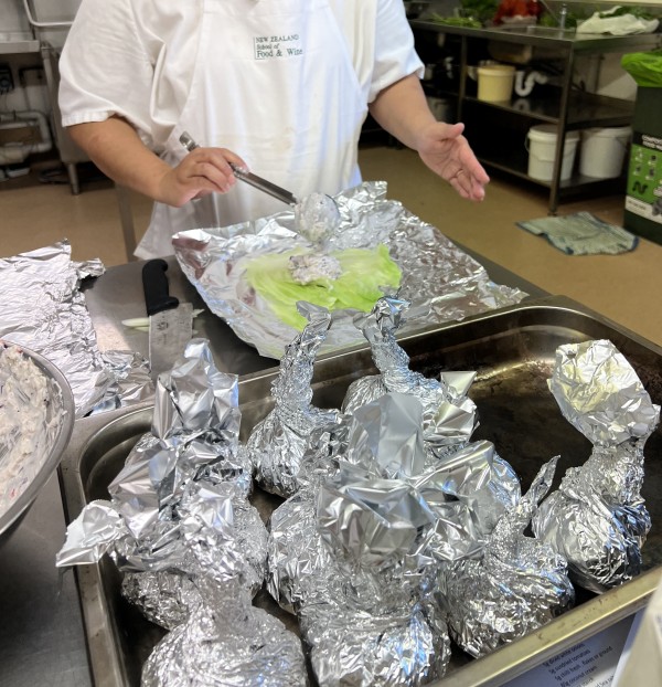 Chef Marlene opens the foil packages of taro and coconut cream and spoons them onto baked taro wafers.
