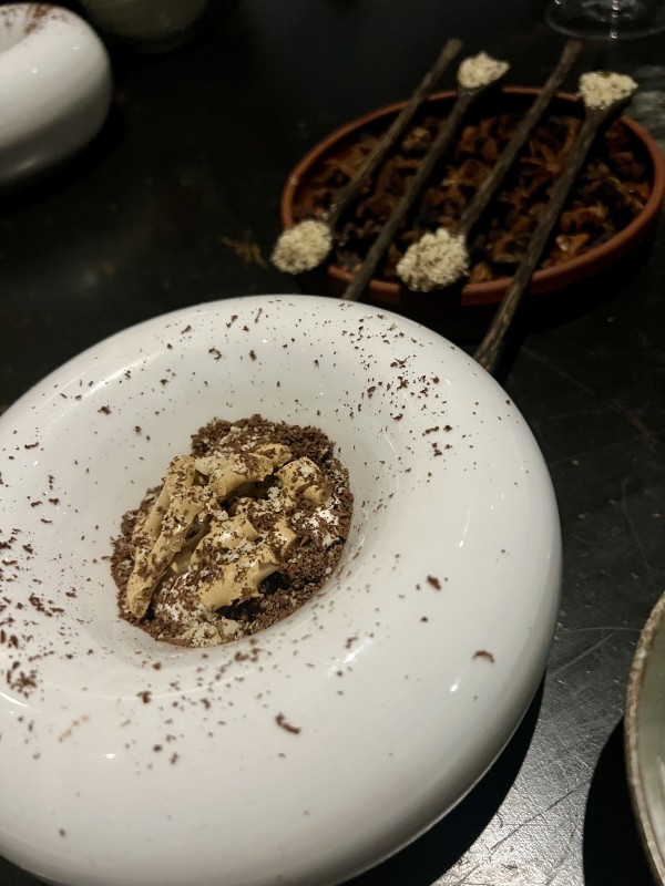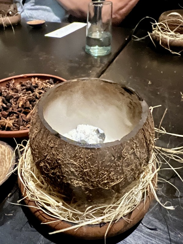 Copra is dramatically presented in a smoking coconut shell with a frozen ice of dried coconut flesh.
