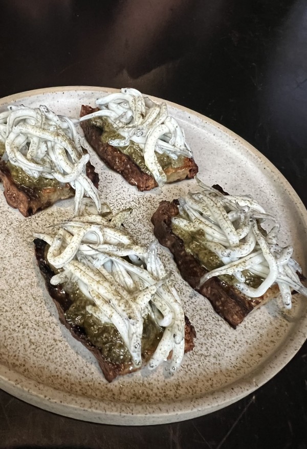 Palolo: Taro focaccia with whitebait, Coconut reduction, dusting of sea weed.