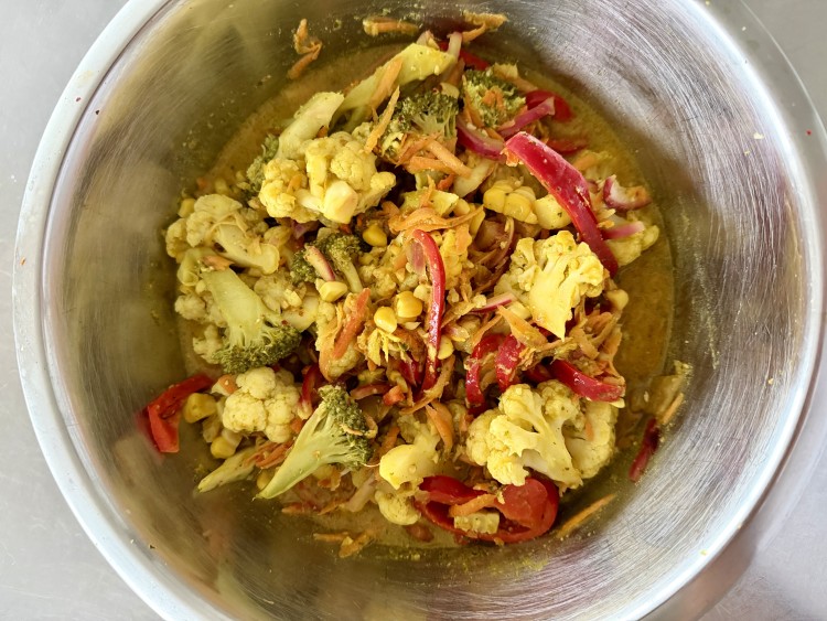 - Pour in extra virgin olive oil, as much as you need to coat the vegetables