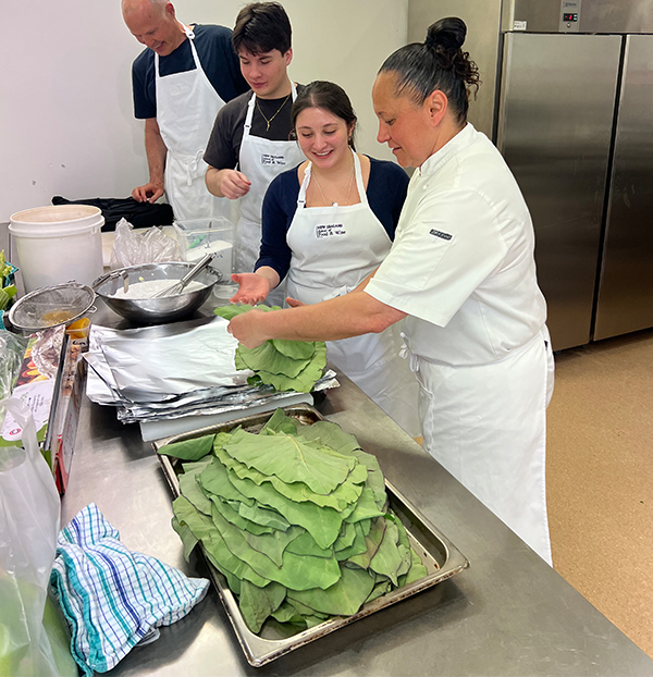 Chef Marlene opens the foil packages of taro and coconut cream and spoons them onto baked taro wafers.