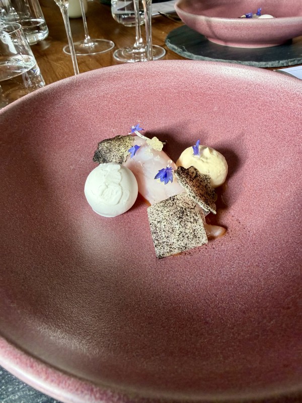 Snapper, sweetcorn, turmeric, kaffir lime, watermelon radish with Dr Loosen Wehlener Sonnenuhr 2020.
