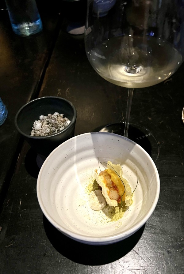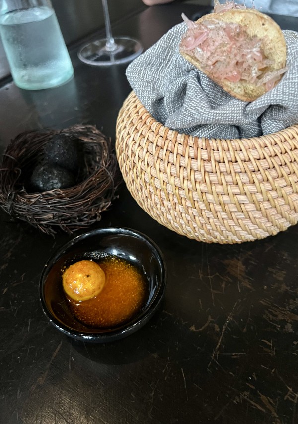 Palolo: Taro focaccia with whitebait, Coconut reduction, dusting of sea weed.