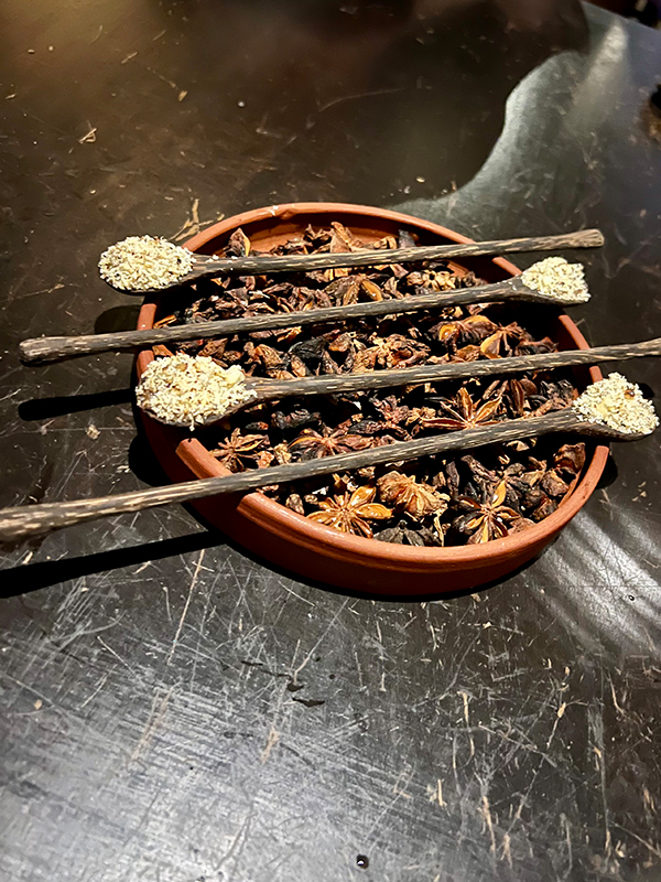 Copra is dramatically presented in a smoking coconut shell with a frozen ice of dried coconut flesh.